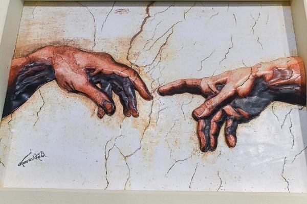 A exposição é integrada por 15 peças tridimensionais e táteis, que fazem uma releitura de obras consagradas de nomes como Michelangelo, Van Gogh, Frida Kahlo e Tarsila do Amaral. Adepta da técnica chamada de “arte francesa” – que envolve a sobreposição de camadas e perspectivas de profundidade -, Bety Alvarenga utilizou tinta, papel, tecidos, algodão e até um brinco de pérola para formar relevos e conseguir texturas, recursos que prometem guiar as mãos e a imaginação do público.