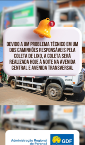 Informamos que, devido a um problema técnico em um dos caminhões responsáveis pela coleta de lixo, a coleta será realizada hoje à noite nas seguintes áreas:
