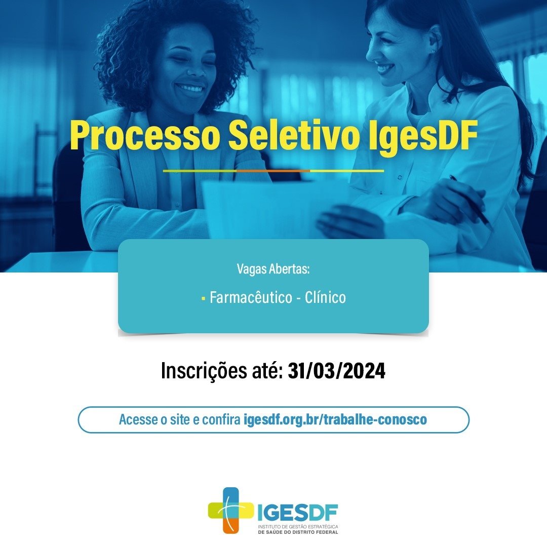 Estão abertas as inscrições para o processo seletivo para cadastro reserva de Farmacêutico Clínico no Instituto de Gestão Estratégica de Saúde (IgesDF). Interessados tem a partir desta segunda-feira (25) até domingo (31), para se inscreverem. A vaga tem a remuneração bruta de R$ 6.610,78 e carga horária de 44h semanais.