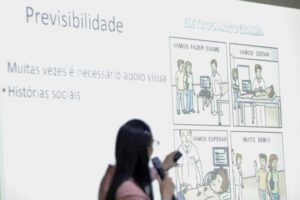 A médica Ellen Siqueira, neuropediatra do Hospital da Criança de Brasília José Alencar (HCB), apresentou a palestra “Atendimento humanizado em ambientes de saúde a pacientes com Transtorno do Espectro Autista (TEA)” e falou sobre os desafios do atendimento. “Cada pessoa que possui o transtorno do autismo é diferente da outra. É necessário que os médicos estejam cientes de que muitas vezes será um atendimento demorado e que deve ser adaptado individualmente.”