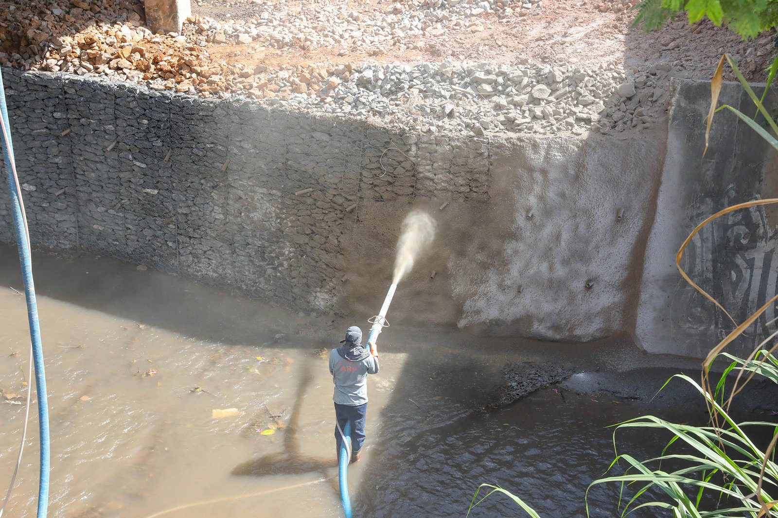 “A gente está jateando concreto na superfície externa do muro de arrimo que fica virado para o lado do córrego, justamente para dar mais proteção no próximo período chuvoso, quando o nível da água do córrego se eleva. E isso, consequentemente, vai proteger o aterro de um possível desmoronamento no futuro”, explicou Jarbas da Silva, engenheiro do DER-DF.