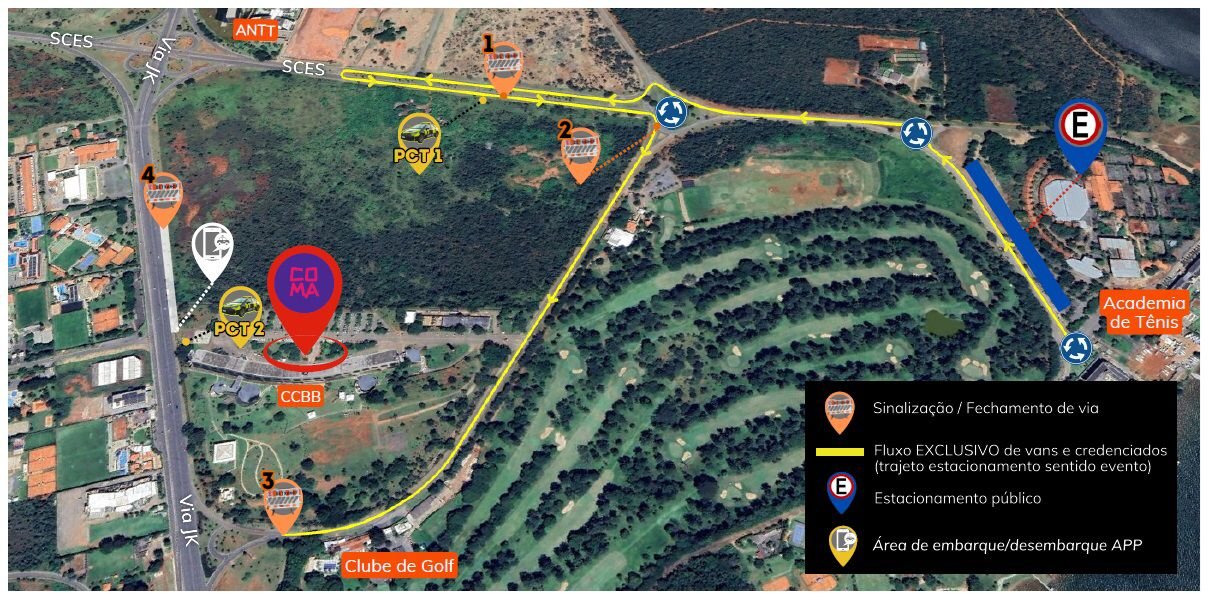Sábado (3) e domingo (4), haverá alterações no tráfego nas imediações do Centro Cultural Banco do Brasil (CCBB), SCES Trecho 2, para a realização do Festival CoMA Família e Conferência. Das 10h às 23h59, os acessos pela via JK ao Clube de Golf estarão fechados para a implantação de fluxo exclusivo de vans e credenciados do evento que levarão os participantes do estacionamento público próximo à Academia de Tênis até o Clube de Golf. Para quem utilizar o Serviço de Transporte Individual Privado de Passageiros por Aplicativos (STIP), haverá uma área de embarque e desembarque na faixa mais à direita da via JK, próximo ao portão de acesso ao CCBB, ficando duas faixas liberadas para o fluxo de veículos.
