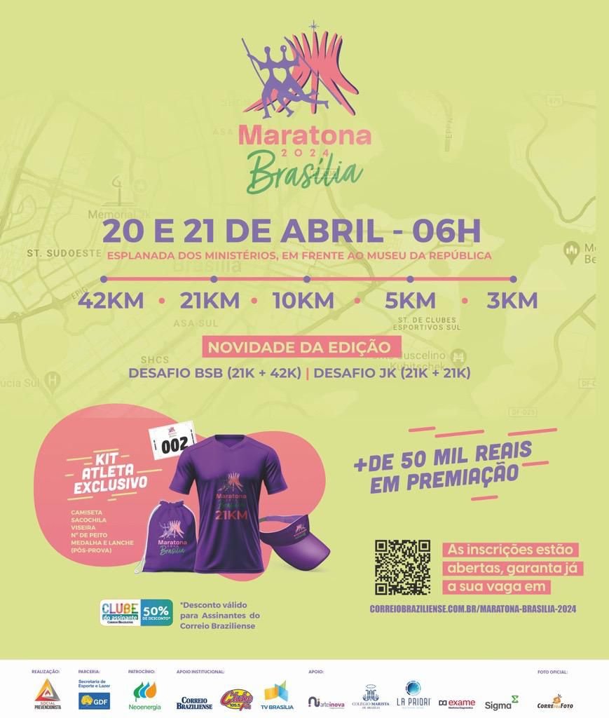E tem mais: em 2024, a novidade fica por conta do Desafio Bsb 64 anos e do Desafio JK. O primeiro consiste em correr a meia maratona no sábado (20/04) e a maratona no domingo. Já o segundo é participar de duas meias maratonas, uma em cada dia. Quem completar um dos dois desafios, além das medalhas tradicionais das duas provas, irá ganhar uma terceira premiação.