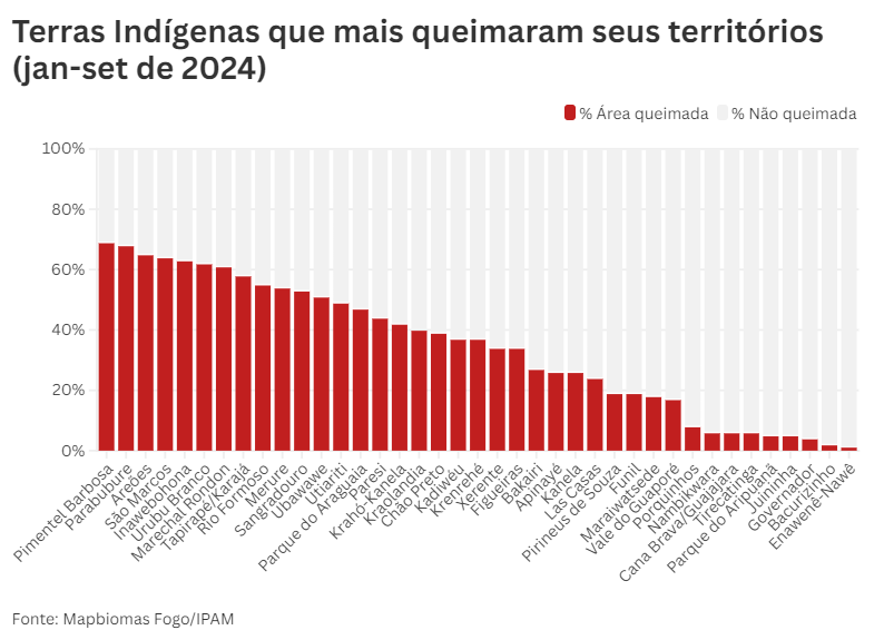 Entre janeiro e setembro de 2024, 24% dos territórios indígenas queimaram mais de 30% de sua área. O total atingido pelo fogo em terras indígenas foi superior a 2,8 milhões de hectares.