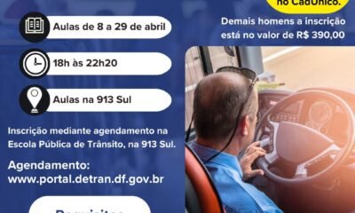 Aulas serão ministradas de 8 a 29 de abril, das 18h às 22h20, na Escola Pública de Trânsito (913 Sul)...